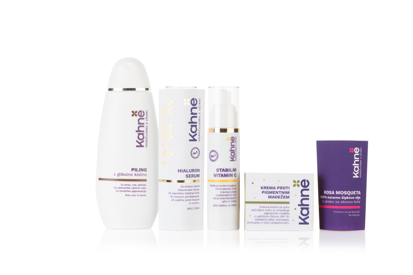 Nikoli ne kombinirajmo preveč aktivnih sestavin hkrati (npr. vitamin C + retinol + AHA) brez posveta. Komplet proti pigmentnim madežem Kozmetike Kahne je sestavljen tako, da upošteva sinergijske učinke vseh izdelkov v ustreznih koncentracijah, ki ohranjajo barierno funkcijo kože.