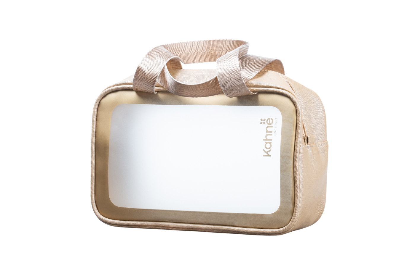 - Zlato-bež kozmetično torbico dimenzij 23cm dolžina, 15cm višina, 9cm globina, ki je odporna na vlago
