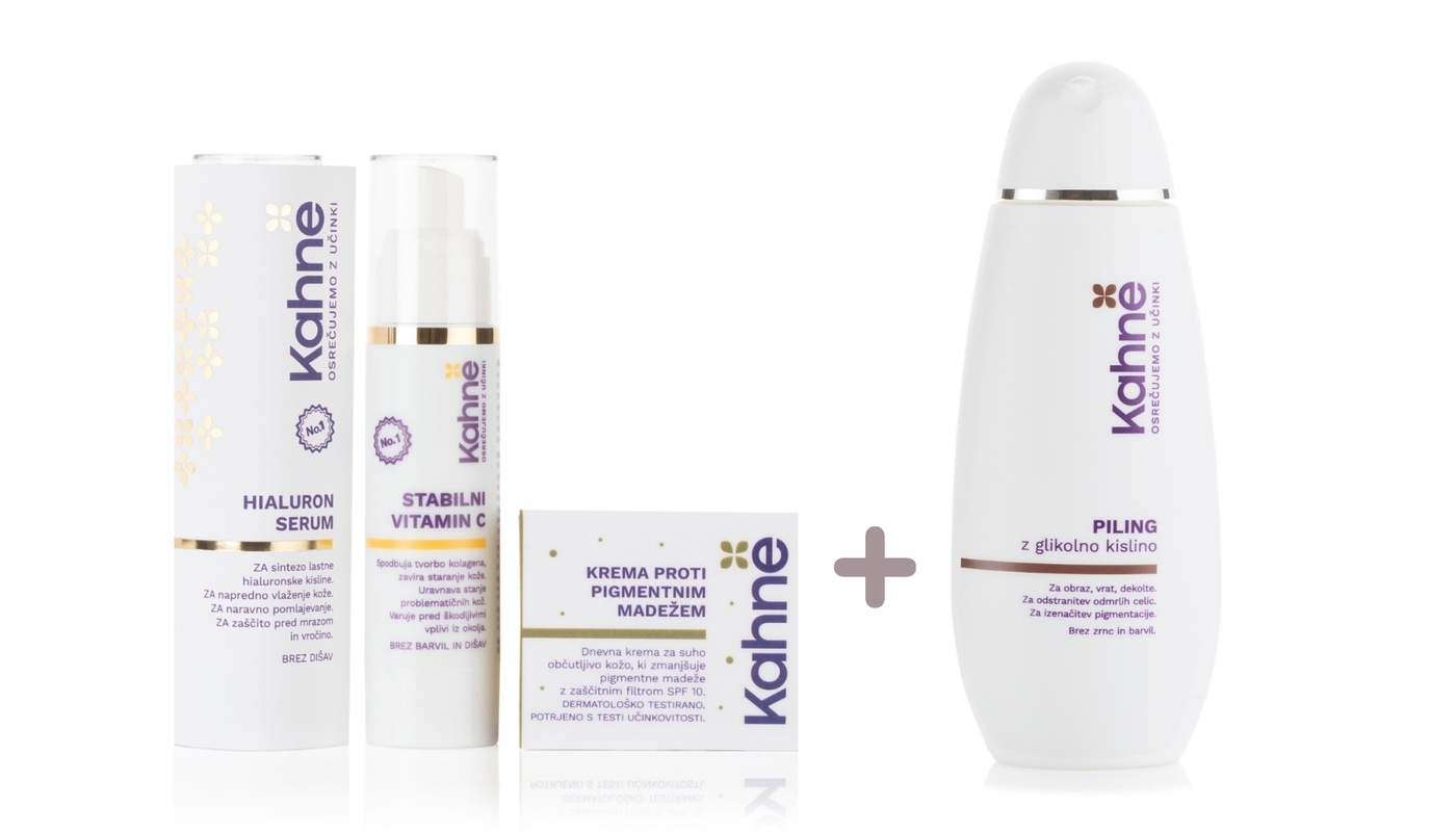 Paket je sestavljen iz treh izdelkov Kozmetike Kahne, družinskega podjetja s 40 letno tradicijo na področju nege obraza. Zajema celostno nego obraza za kožo, ki ima pigmentne madeže. Koži izdelki zagotavljajo vse potrebne sestavine, da si ta opomore in regenerira in da pigmentni madeži postanejo manj vidni (testi za kremo: 52% zmanjšanje pigmentnih madežev po 8 tednih redne uporabe).Več nastanku pigmentacije in o negi kože s pigmentnimi madeži: