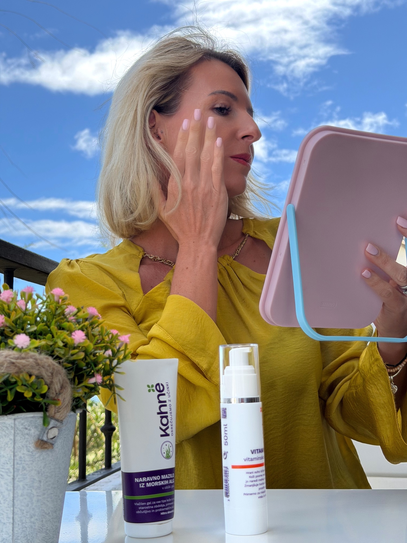 Očistite obraz. Na dlan izstisnite gel iz morskih alg (količina češnje), vanj pa pomešajte Stabilni vitamin C in vitamin E. Tako enostavno. Nanesete direktno na obraz, vrat in dekolte. Količina posameznega vitamina je navedena na embalaži in je odvisna od tega ali je vaša koža normalna, suha ali zelo suha. Pri mastni koži uporabimo samo kombinacijo gela iz alg in Stabilnega vitamina C.