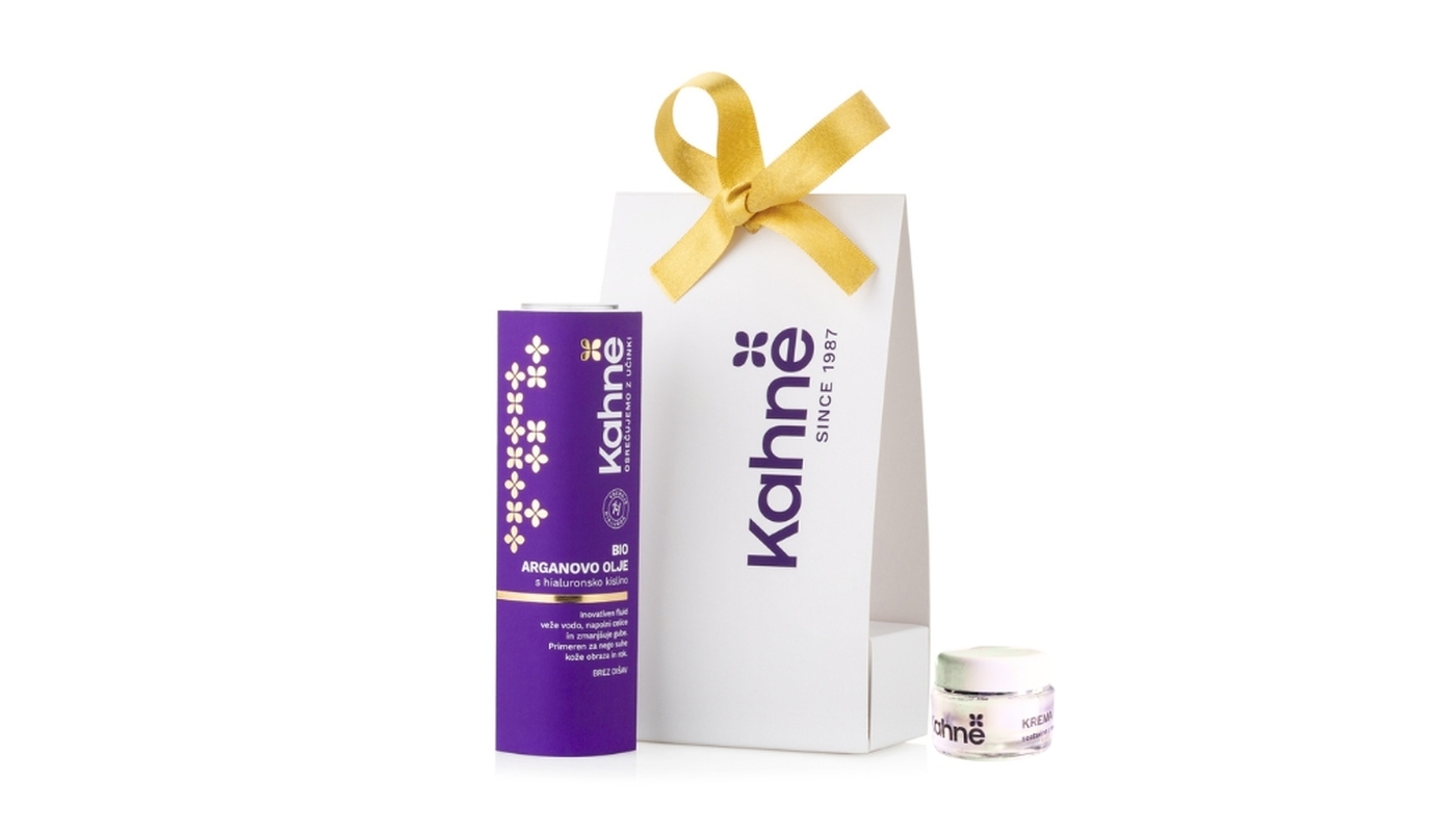 Darilno pakiranje vsebuje Bio arganovo olje s hialuronom (50 ml) v darilni embalaži s pentljo, dodano je mini pakiranje kreme (5ml) po vašem izboru.